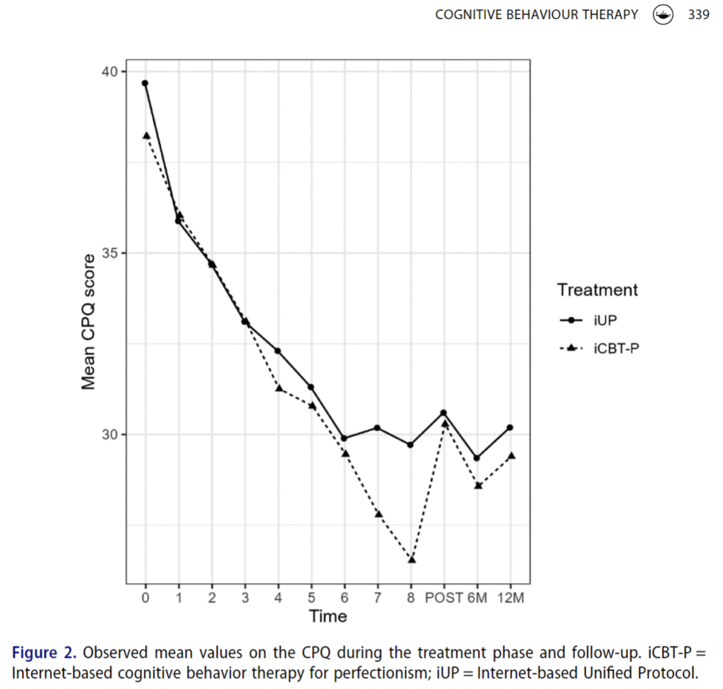 I vår randomiserade kontrollerade studie involverade vi 138 deltagare som sökte hjälp för sina perfektionistiska tendenser. Förvånande nog visade båda behandlingsformerna stora inomgruppseffekter på Clinical Perfectionism Questionnaire vid eftermätningen och de upprätthöll effekterna vid uppföljningar efter 6 och 12 månader. Sekundära utfall såsom depression, ångest, livskvalitet, självmedkänsla, procrastination och stress visade små till stora effekter. Åter igen utan signifikanta skillnader mellan behandlingsformerna.
