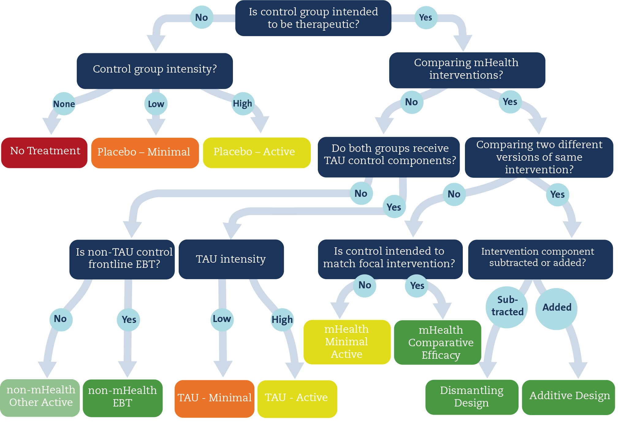 Hundratals randomiserade kontrollerade studier har testat behandlingseffekten av olika mobilappar vid psykologiska problem (mHealth). Dessa studier har använt en rad olika kontrollgrupper (t ex väntelista, minimal uppmärksamhetskontroll, psykologisk placebo). Valet av kontrollgrupp påverkar dramatiskt vilka vetenskapliga slutsatser som kan dras från en given studie. Tyvärr saknas helt praxis inom mHealth. Ett av problemen blir att metaanalyser klumpar ihop äpplen och päron (eller kanske äpplen och solstolar).