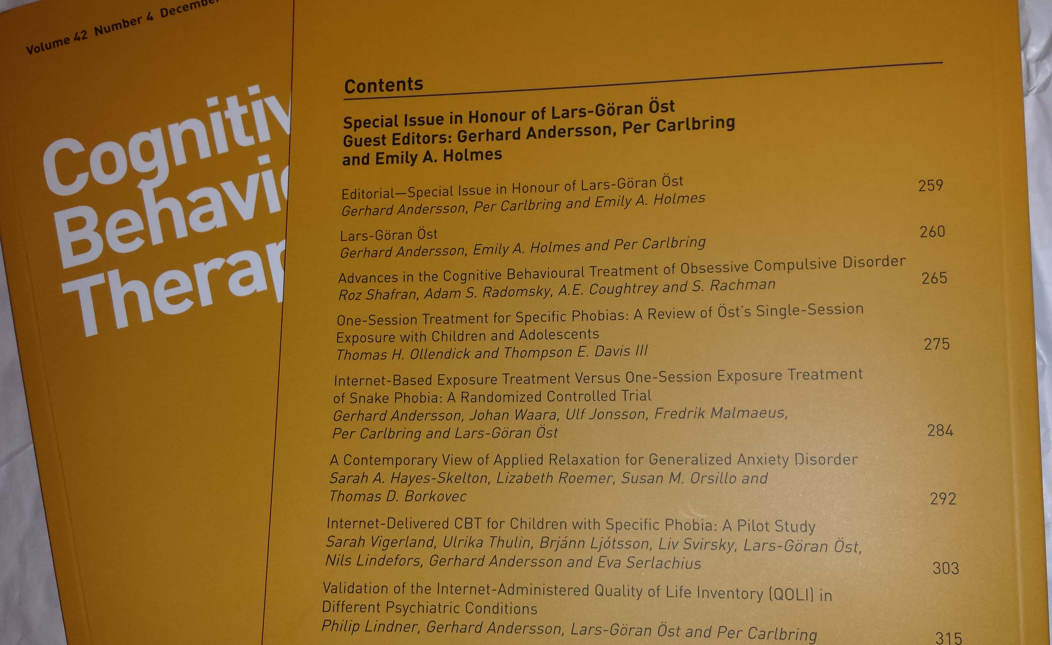 Today we published a new issue of Cognitive Behaviour Therapy. It is a special issue in honor of Lars-Göran Öst. Lars-Göran Öst stands tall as one of the most prominent clinical researchers in the field of cognitive behavior therapy (CBT), and a founder of CBT in Sweden. He recently retired from his position as professor in clinical psychology at Stockholm University, Sweden.
