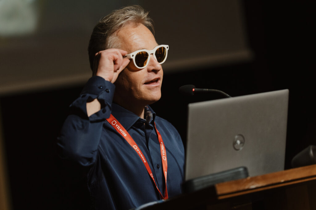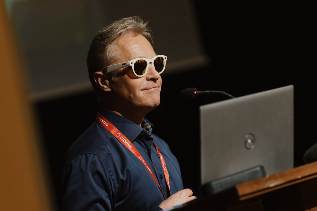 Det var något symboliskt över att stå på scenen i Vilnius University Theater Hall med mina AI-glasögon på huvudet medan jag höll min keynote om “AI in Psychotherapy: From Science Fiction to Clinical Reality”. Tekniken som jag pratade om – AI:s roll i psykoterapi – filmade samtidigt hela upplevelsen från mitt perspektiv. Meta, skulle man kunna säga (i dubbel bemärkelse för fabrikatet på glasögonen var just Meta Oakley).