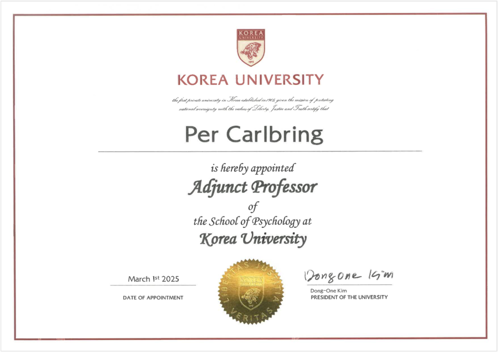 Från och med den 1 mars 2025 har jag utsetts till gästprofessor vid School of Psychology, Korea University i Seoul, Sydkorea. Utnämningen sammanfaller med universitetets 120-årsjubileum och är en del av deras internationella satsning “K-CLUB” (som står för KU-Collaboration Hub). K-CLUB samlar ett globalt nätverk av forskare inom olika discipliner för att ta itu med några av världens mest angelägna samhällsutmaningar.