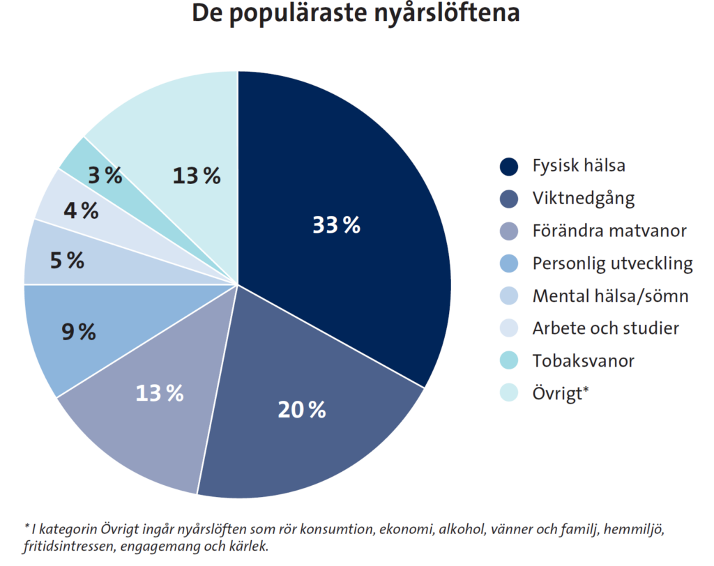 - De mest populära nyårslöftena är kring fysisk hälsa, viktnedgång och förändrade matvanor (se graf 1).